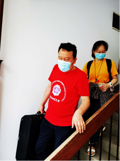 国际合作与交流处党支部书记姚杰、孙弛老师,体育赛事直播 教工第二党支部书记周标老师,郑洪举老师,民主党派程水英老师,青年教师洪忠婷来到体育赛事直播 女生宿舍,帮助学生打包和运送行李。