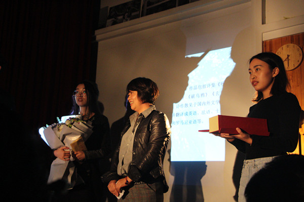 在北河身体剧场小而温馨的空间中,舞蹈与诗歌,文字与声音融合在了一起。让一切仿佛回到了诗最本质的样子。在诗歌朗诵后颁奖正式开始了,当鲁竹老先生颤巍巍的将奖杯颁给孙冬时,我看到的不仅仅是颁奖本身,我还看到了中国文化的传递。授奖辞中这样说诗人孙冬:孙冬女士数十年如一日地,行进在汉语的冒险之境,创造出了令人信服的语言和智识景观。随后诗人孙冬也分享了自己的获奖感言,她说,自己写诗,经常也会走到诗歌之外去,也有语言的久违感,只不过总能把握住诗歌内在的东西。诗歌中的我既非主体也非客体,既非真实亦非虚构,既非个人又非群体。来自各地的诗人们发表对孙老师诗歌的点评并朗诵孙老师的诗歌。也有孙冬老师的粉丝向孙冬老师大胆表示喜爱与一些困惑,让思想以诗歌为载体碰撞出了火花。