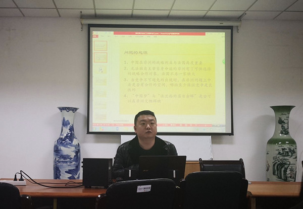 3月5日周一晚6:30在德政楼308会议室,盐城师范体育直播平台 法语系主任游滔博士为体育赛事直播 学生作了“中法非三方竞争和合作关系”的讲座,讲座由体育赛事直播 法语系主任顾晓燕老师主持。