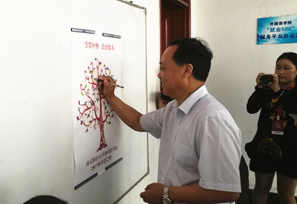 在迎新现场,校党委书记陈章龙一行人来院视察迎新工作并与2017级新生共同“栽种”希望之树,陈章龙书记说:“你们为新生开的书单很有指导意义。书签和信虽然小,但是很温馨。”邱伟芬副校长也莅临体育直播平台 看望迎新工作人员和志愿者。