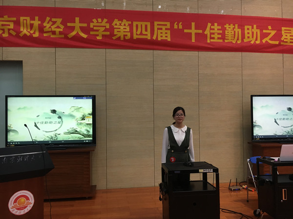 本次活动共分为三个阶段,经过激烈的预赛和复赛,最终有15位同学脱颖而出,进入了本次活动的决赛。他们都是学校勤工助学岗位上的好榜样。决赛现场,他们向评委和观众讲述着自己的勤工助学经历和对勤工助学的看法并带来了精彩的才艺展示,同时以表演的形式创意再现自己的工作情景。体育赛事直播 英语1501班张瑜同学认真负责的工作态度和乐于奉献的服务精神打动了评委,在才艺展示环节,她的一曲侗歌更是给大家留下了深刻的印象,最终荣获南京财经大学“十佳勤助之星”称号。