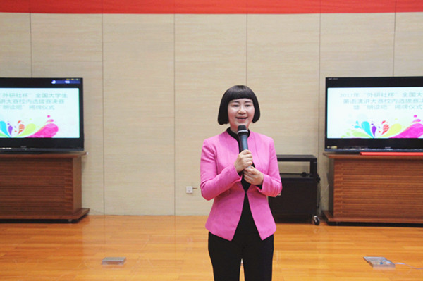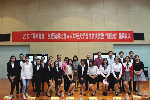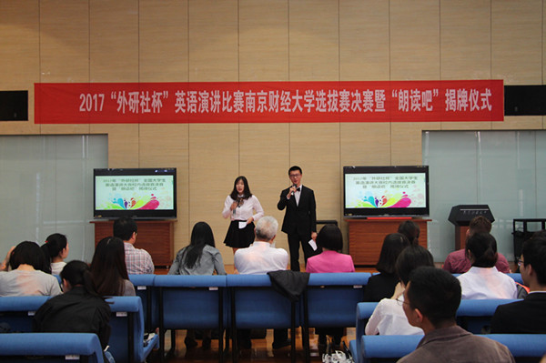 5月9日晚,2017“外研社杯”全国大学生英语演讲大赛南京财经大学选拔赛决赛暨“朗读吧”揭牌仪式在图书馆“世界之窗”顺利举行。本次比赛是我校第十四届外语文化节的子活动,由体育直播平台 承办。校研究生处处长张为付、校教务处副处长阚京华、体育直播平台 党委书记刘浩、院长肖辉、新闻体育直播平台 副教授黄一斓、国际处留学生工作科科长张楠、外教Andrew Voda担任了此次决赛的评委。