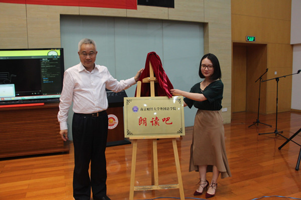 在比赛过程中,还穿插了体育直播平台 为营造外语学习和诵读兴趣,提倡高品位阅读而创办的“朗读吧”的揭牌仪式。揭牌仪式上,体育直播平台 的部分师生做了朗读吧活动展示,英语1502班刘以康同学用英文朗读了泰戈尔的诗歌《生如夏花》;法语1501班王沁晔、周昊瑾同学法语朗读了小说《情人》片段;体育直播平台 李慕原老师和英语1501班崔若愚同学用中文朗读了散文《我喜欢》。随后,校研究生处处长张为付与朗读吧第一期轮值吧长体育直播平台 陈轶梵同学共同为“朗读吧“”揭牌,轮值吧长们分别为指导老师颁发聘书。
