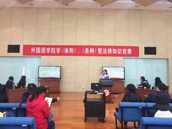 比赛围绕学习党的十八届六中全会审议通过的《准则》、《条例》进行,结合生活中常见的法律常识,以党支部为单位,分为教工组和学生组进行对决,每个党支部推荐了两名党员参赛,比赛采取抢答的方式。经过预选赛激烈的角逐,教工二支部和本科生党支部进入终极对决。比赛中,各参赛队伍反应迅速,竞相展现丰富的知识,正答率极高,难分伯仲。本次竞赛的知识点围绕《准则》、《条例》和法律知识展开,选题范围极广,难度较大,但选手们密切配合,将比赛一次次推向高潮。各论比赛期间还组织了观众互动答题活动,吸引了在场师生的积极参与。