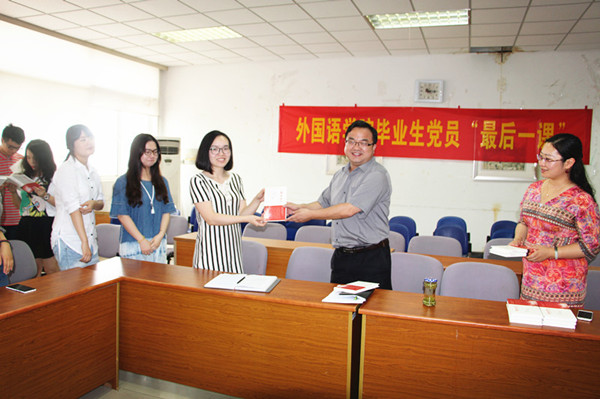 6月19日,体育赛事直播 在法政学科楼308会议室举办2016届毕业生党员“最后一课”。党课开始前,毕业生党员们在图书馆前面对党旗庄严地举起右拳,由党员王磊同学领誓,一起重温了入党誓词。在最后一次党课上,体育直播平台 党委刘浩书记叮嘱毕业生党员在未来的日子里,要时刻谨守自己党员的身份,主动承担一名党员应当承担的责任,坚定为党的事业、为祖国的建设奋斗终身的崇高理想。体育直播平台 还向全体毕业生党员赠送了南京航空航天大学徐川同志的著作《节节向上》,希望毕业生党员在毕业后的工作生活节节向上,永葆党性,永远充满正能量。