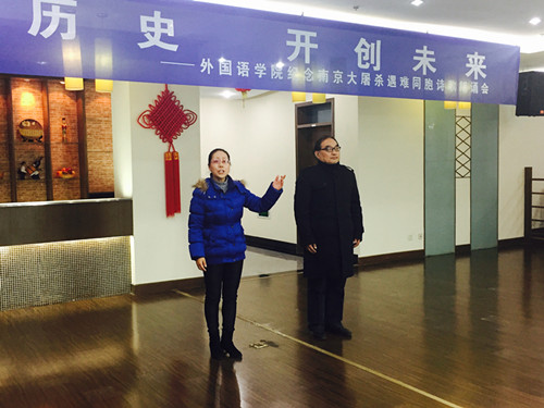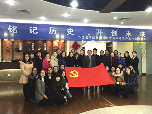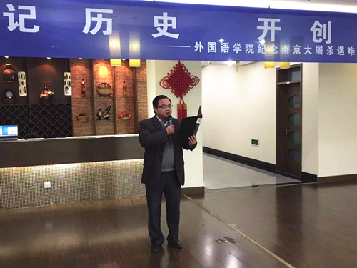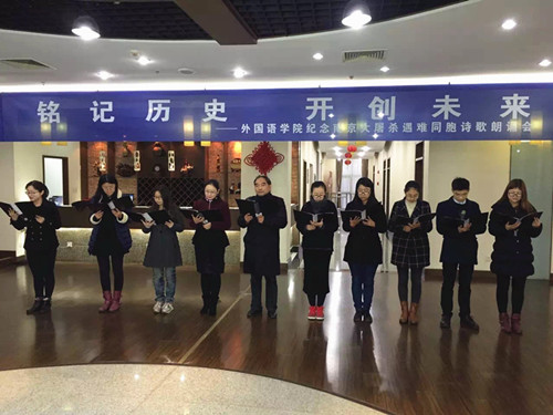 在第二个国家公祭日到来之前,为了向在南京大屠杀中遇难的同胞表示深切的哀悼,12月10日下午,体育赛事直播 组织全体党员在行政楼17楼教工之家举办了“铭记历史,开创未来——纪念南京大屠杀遇难同胞诗朗诵会”。院党委书记刘浩、校党委保卫部副部长金立林、副院长孙勇彬、党委副书记李慕原,体育直播平台 全体教工、学生党员参加了朗诵会。