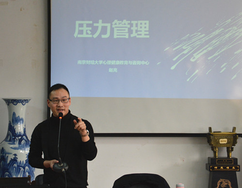 同时,此次座谈会还邀请了校心理健康教育与咨询中心赵亮老师为大家做了心理减压交流。赵亮老师首先为大家做了减压小测试,并对测试结果进行分析。通过了解了老师们平常压力的来源后,赵老师结合自己的经历为老师们如何进行自我减压提出了建议,并为老师们进行了催眠减压。