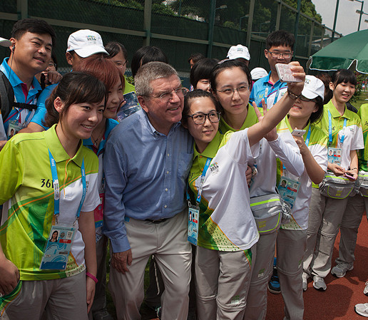 8月20日,国际奥委会主席托马斯·巴赫到访南京市水上运动学校,参观主要区域,观看赛艇比赛,并与志愿者一起玩自拍。