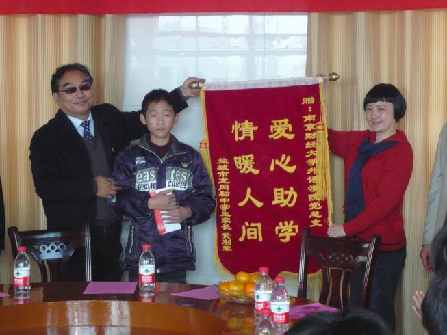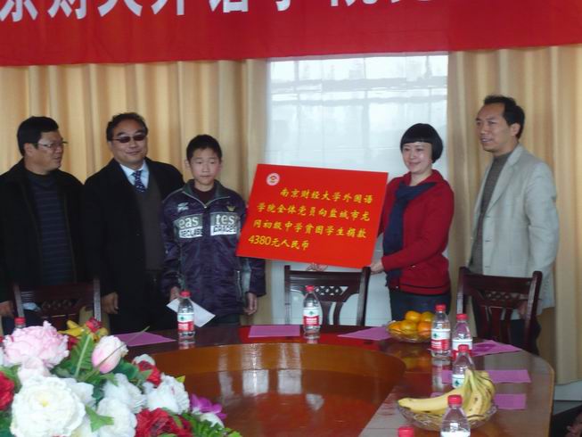 随后,党员们来到了盐城市龙冈初级中学开展奉献爱心活动。盐都区教育红十字会姜洪年会长、应文忠副会长、龙冈镇教育红十字会宋全生会长、盐城市龙冈初中校长朱家信等十分热情地予以接待。捐赠仪式由盐都区龙冈镇教育工作负责人宋仓生主持。参加此次捐赠活动的有体育直播平台 全体党政领导和教师党员。首先体育赛事直播 党总支书记肖辉教授代表体育直播平台 全体师生党员热情接待、精心安排和为体育赛事直播 在“争先创优,奉献爱心”活动中搭建这么好的平台的龙冈中学表示了衷心的感谢,并就此次活动的形成和意义做了讲话,同时衷心希望接受捐赠的黄鑫同学好好学习、天天向上、早日成为国家的栋梁。随后龙冈镇教育局副局长姜洪年也代表龙冈镇教育局对我们的这次捐赠活动的重要意义表示充分肯定,并对体育直播平台 的到来表示了热烈的欢迎。院长王克明教授也对龙冈中学的热情接待表示了衷心感谢。隆重的捐赠仪式正式开始。体育赛事直播 向黄鑫同学当场捐赠了全体师生党员捐款4380元及图书40余册。与此同时也体育赛事直播 接受了盐城市龙冈初中学生家长黄利军赠给体育赛事直播 的“爱心助学、情暖人间”的锦旗。黄鑫同学虽遭遇家庭不幸,父亲瘫痪在床,母亲下岗,但仍自强不息,勤奋学习,成绩优异,体育直播平台 党总支将全体师生党员捐款及图书当场捐给他,勉励他克服困难,积极奋进,以优异的成绩回报党和人民。接着,体育直播平台 党员教师结合自身的专业特点和龙冈中学部分同学开展了英语交流活动,在热烈轻松的氛围中,师生共同探讨英语学习的经验与技巧,激发了学生学习英语的兴趣,增强了他们的口语交际能力。最后党员们还在龙冈镇中合影留念。