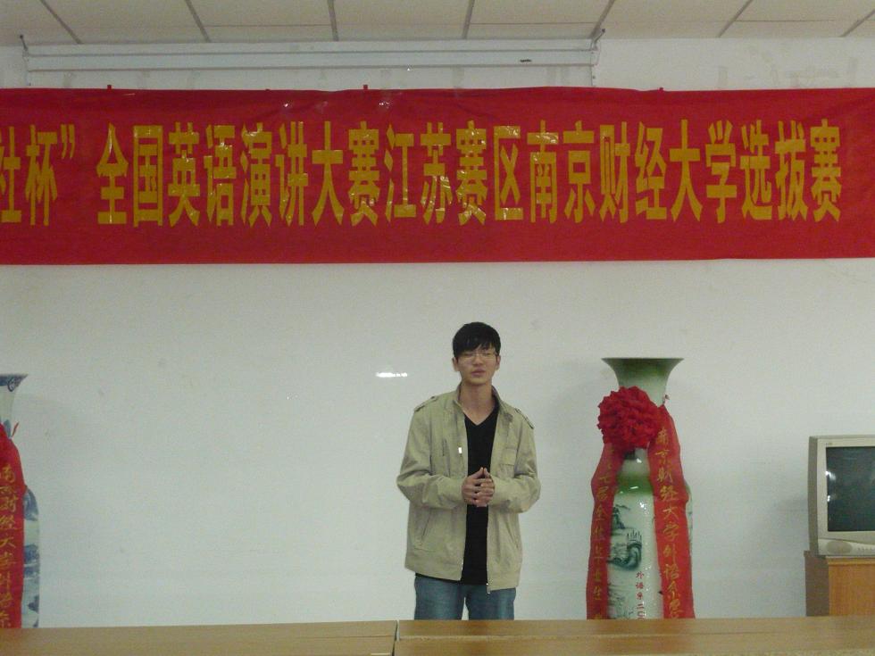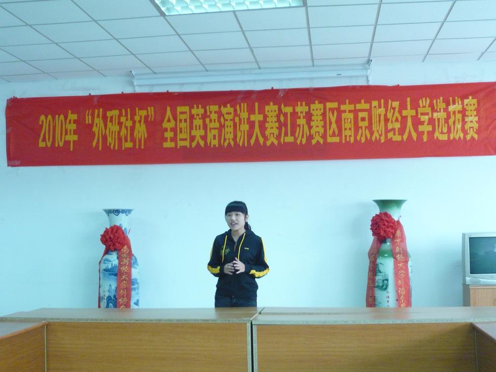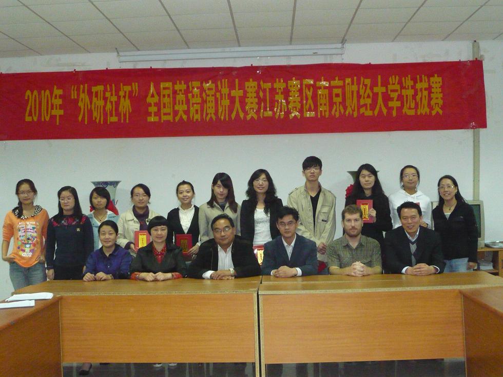 2010年10月13日14:00,2010年“外研社杯”全国英语演讲大赛江苏赛区南京财经大学选拔赛在专三308拉开帷幕。42位参赛选手带来了他们自选主题的精彩演讲。此次选拔赛有评委老师有院长王克明教授、党总支书记肖辉教授、国际合作与交流处黄能副处长,副院长孙勇彬教授、外教Devek和韩静老师。