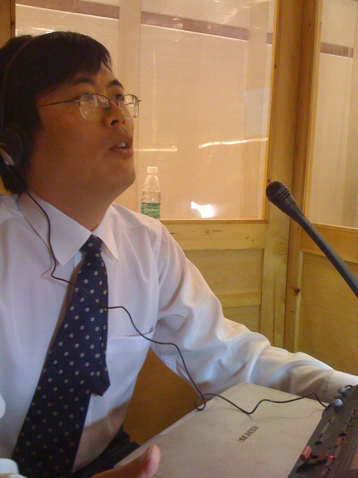 (图一)体育赛事直播 褚玉襄副教授正在为"国际电子商务高峰论坛"做同声传译