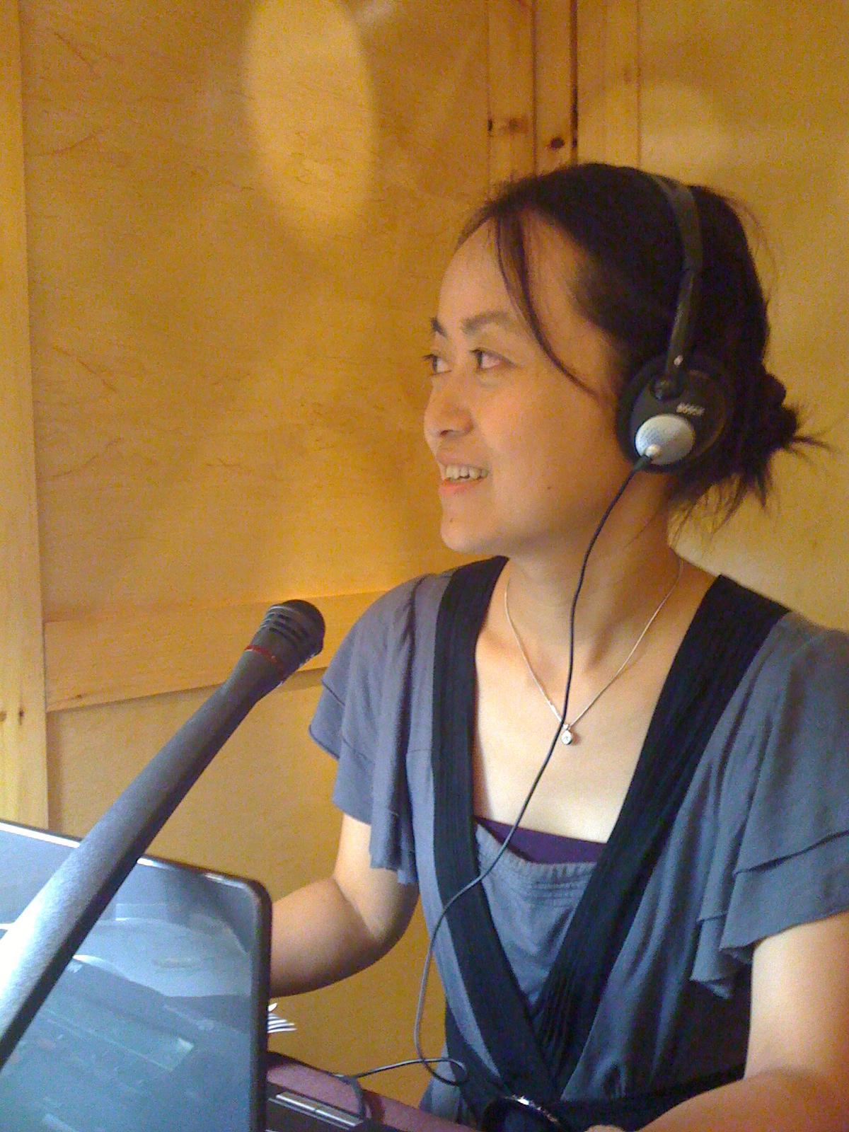 (图二)体育赛事直播 优秀青年教师丁颖正在为"国际电子商务高峰论坛"做同声传译
