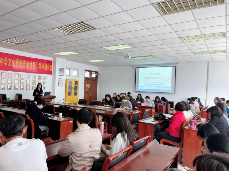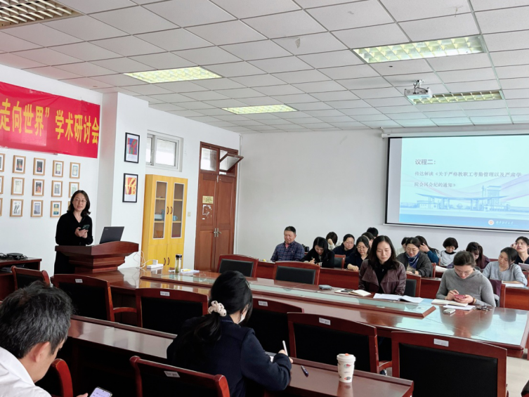 英语系主任张晓甜向全院教师传达了学校近期本科教学工作会议的内容,包括:第三批国家一流本科课程申报准备工作、期末考试组织工作、期中教学检查事宜、专业审核评估,以及体育赛事直播 两位教师教学事故的处理通报等。教学顾问邵怡向大家解读了相关教学规范与纪律,传达了近期教学检查、教学座谈会意见反馈等情况,鼓励老师们以昂扬的态势迎接本科教育教学评估的到来。