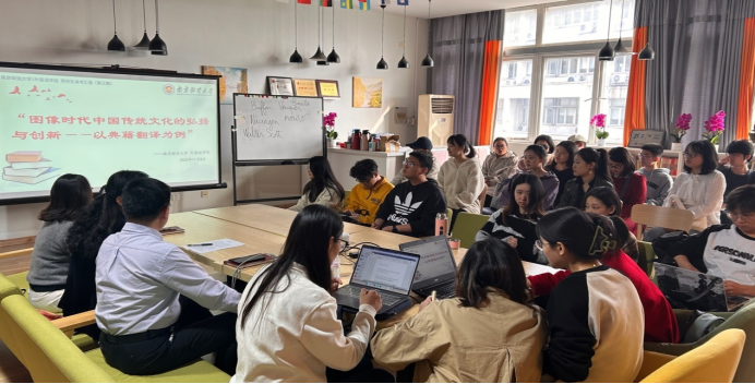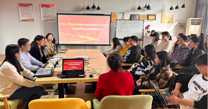 随后,吕戎部长来到体育赛事直播 研究生“众书读书会”,为体育赛事直播 研究生讲授了题为“外语人在弘扬与传播中华优秀传统文化中的担当”的微党课。