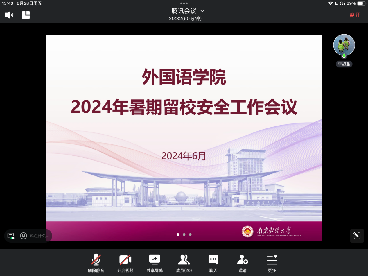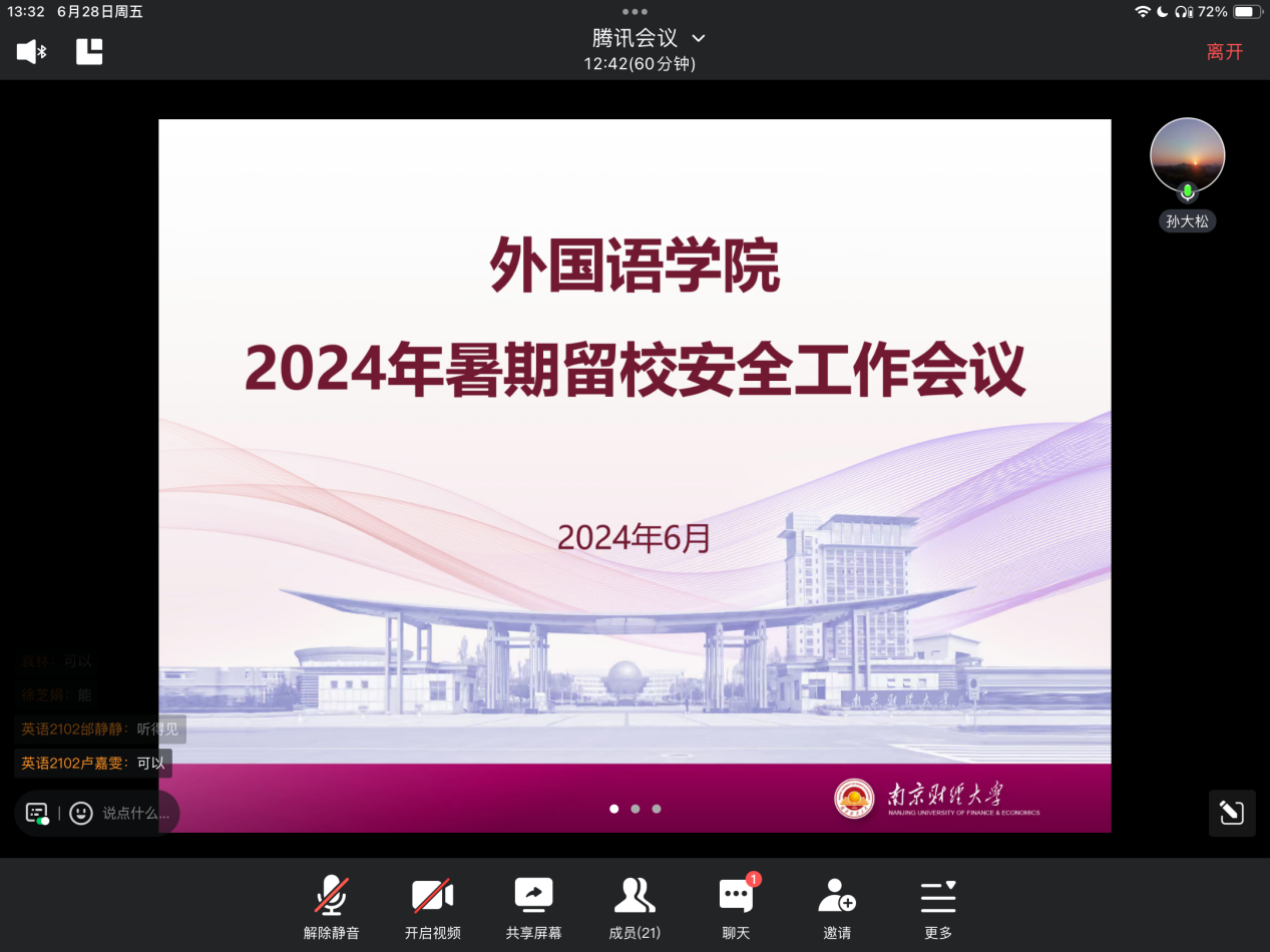 加强学生暑期安全教育,筑牢安全防线,引导学生做好暑期学习生活规划,体育直播平台 6月28日召开2024年暑假留校安全工作线上会议。体育直播平台 党委副书记孙大松、学工办主任李超雅、体育直播平台 全体辅导员、暑期留校的本科生及研究生参加会议。本次会议由党委副书记孙大松主持。