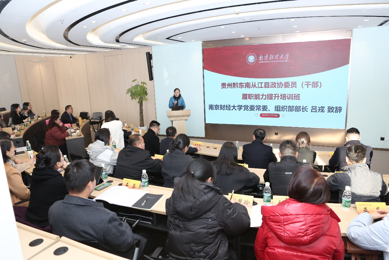 开班仪式上,吕戎部长致辞,她对从江县委县政府对南京财经大学的信任表示感谢,对远道而来参加培训的全体学员表示热烈欢迎,并简要介绍了学校的办学历史、人才培养、专业特色、社会实践等方面的情况。她深情回顾了南京财经大学与贵州从江县长达11年的深厚友谊,特别是“南京财经大学红石榴家园·从江基地”建设的成效。她表示要以本次培训为契机,进一步推动学校服务从江地区高质量发展、铸牢中华民族共同体意识。从江县政协党组副书记、副主席周长青阐述了本次培训的重要性,期望各位政协委员能够借此切实提升履职能力,珍惜培训机会,确保培训效果,遵守培训纪律。