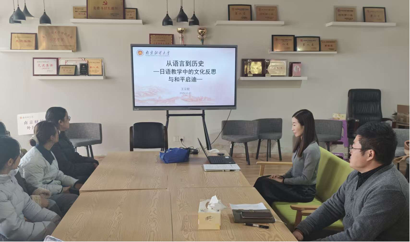 为全面展示教学改革成果,深入推进课程思政建设,2025年11月20日,体育直播平台 日语组王云姣老师就其主持的教改课题《大学初级日语课程思政的探索与实践——从语言渊源到社会问题的多维融合》进行了专场汇报,汇报主题为《从语言到历史:日语教学中的文化反思与和平启迪》。体育直播平台 党委书记陆斌、副书记孙大松以及体育直播平台 部分师生代表参加了本次汇报会。