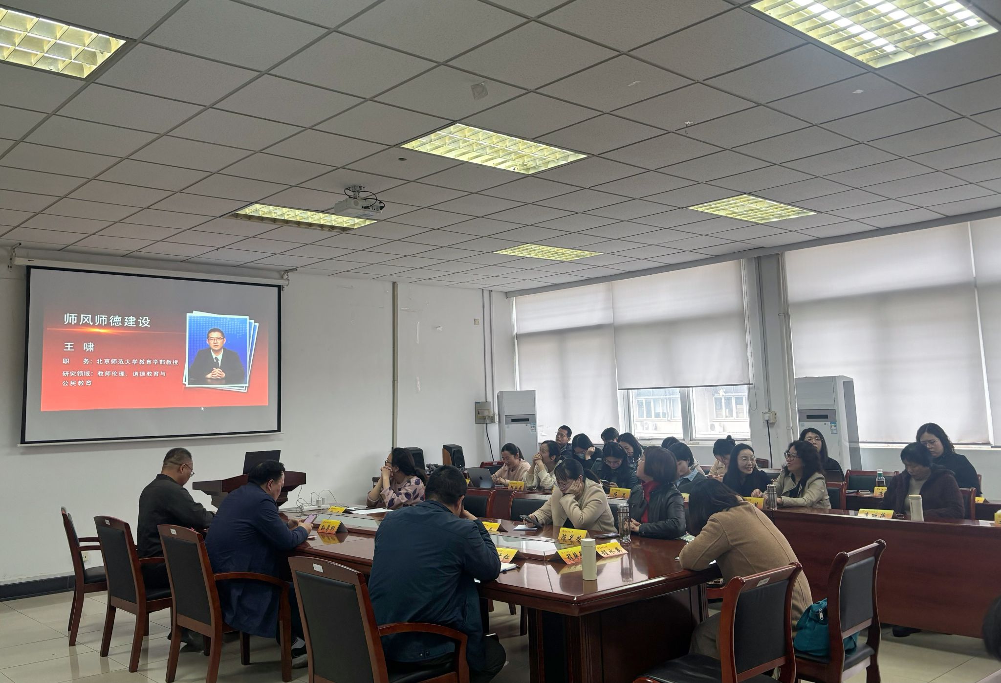 接着,陆斌书记宣贯师德师风教育学习相关文件要求,并通报了体育直播平台 近期推进师德师风教育学习的措施。他指出,要聚集一线教师立德树人实践,重点树立爱岗敬业潜心治学的从教典型;讲好关爱学生暖心陪伴的育人故事;培育担当奉献守正创新的先锋人物。全体与会教师共同收看了由北京师范大学教育学部王啸教授主讲的《师德师风建设之教师关怀》专题视频。通过学习,大家进一步明确了教书育人是教师的天职,教师本身是最重要的教育资源;教师尊严、教师公正、教师关怀相互支撑,形成了相对完整的师风师德建设的架构。