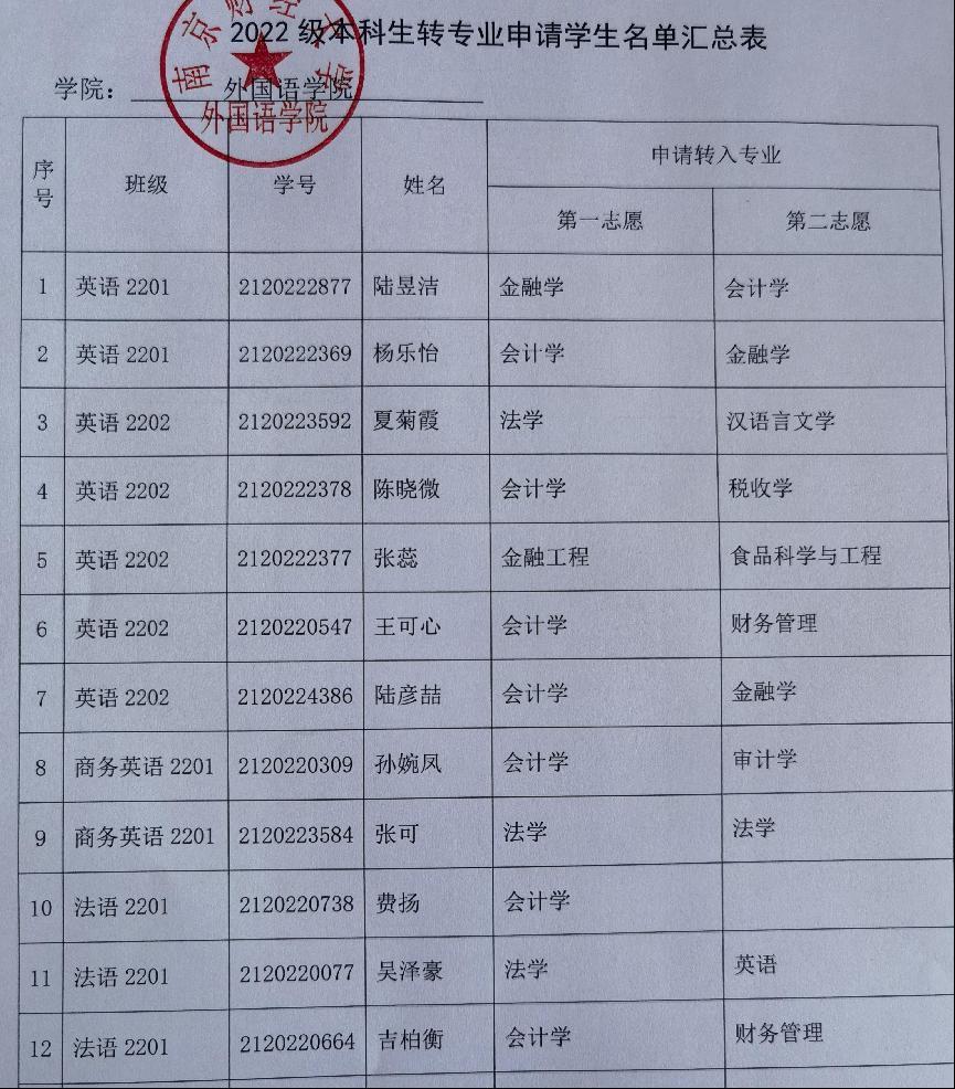 现将2022级申请转专业学生名单汇总公示如下: