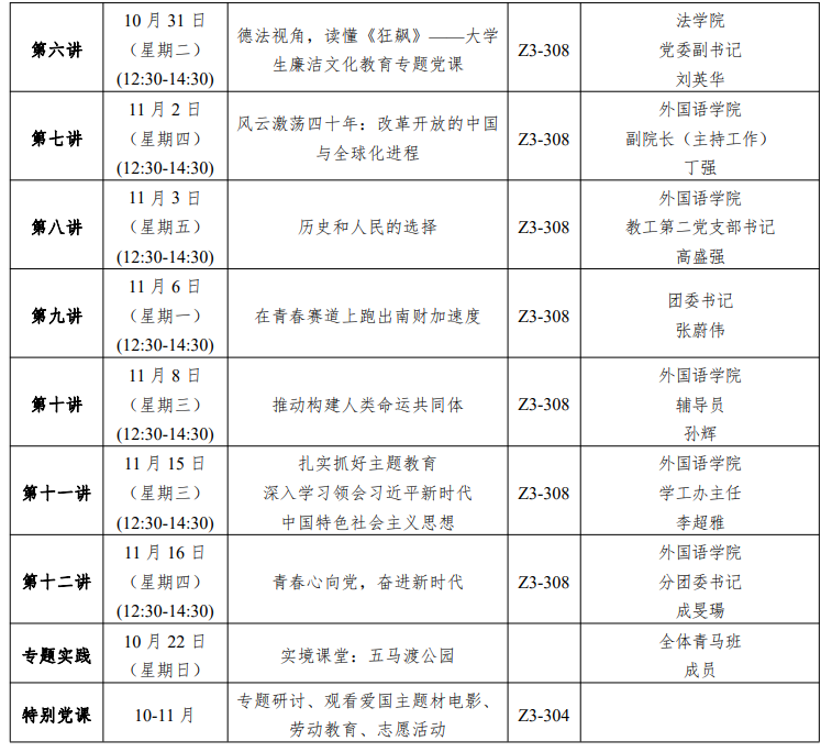 2.青马班结束以后,每位同学须写好心得体会(统一用南京财经大学信笺纸),由组长收好统一于11月17日前交至体育直播平台 分团委书记处(体育直播平台 德正楼310成老师)