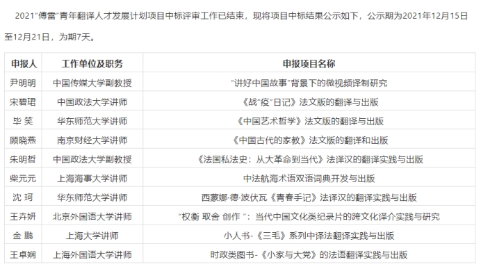 体育赛事直播 法语系教师顾晓燕申请的项目“《中国古代的家教》法文版的翻译和出版”获得2021年“傅雷”青年翻译人才发展计划项目立项。