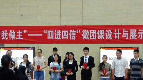 为了促进我校团员青年不断向党组织靠拢,弘扬社会主义核心价值观,广泛参与“四进四信”活动,加强对团章的学习,提升青年大学生的总体素质,成为拥有先进思想的党的后备军,校团委、校学生会于2015年5月28日在图书馆四楼世界之窗举办了“我的团课我做主”——“四进四信”团课设计与展示大赛。