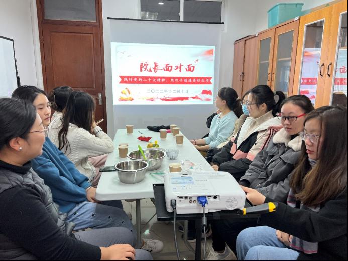 在将蛋糕送往烤箱等待的间隙,邵怡副院长和大家交流起学习中的困惑,特别是在英语写作中的困难,她耐心地向学生们讲解技巧,帮助她们理清思路、寻找技巧。当喷香的戚风蛋糕做出来后,大家一边分享,一边观看英文电影,师生们欢聚一堂,倍感收获。