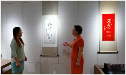 陈芙蓉老师用英文向大家介绍了南京云锦的历史与特点,并重点介绍了云锦的现代创新:如用云锦织就的书法作品。令人惊艳的是,这幅卷轴中的洒金纸效果都是用云锦技术织就而成,充分展示了中国云锦技术的复杂与精妙。