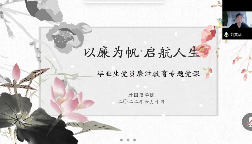 为进一步加强2022届毕业生党员廉洁教育,培养毕业生党员廉洁自律意识,6月10日,体育直播平台 党委副书记兼纪检委员刘英华在线给毕业生党员讲授“以廉为帆,启航人生”廉洁教育专题党课。