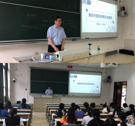 仪式结束后,陶长安校友给体育直播平台 全院毕业生做题为“新时代青年的跨文化素养”的讲座,他指出新时代呼唤跨文化的汇聚融合与创新,既要“跨古今”,又要“跨中西”,凝聚起当代文化人的责任担当与思想力量。随后,陶长安校友全面介绍了蓝鲸培训学校有限公司的发展理念和前景,热切希望有新坚力量的加入,并针对体育直播平台 应届毕业生开展专项招聘活动。