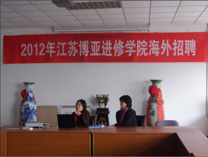 2012年11月7日下午2点,江苏博亚进修体育直播平台 海外招聘会在体育赛事直播 专三308举行。此次招聘会是针对体育赛事直播 英语专业的应届毕业生,工作地点在非洲安哥拉,前期需要在国内进行为期半年的葡萄牙语培训,培训结束到海外从事的是英语及葡萄牙语的翻译工作。来自博亚进修体育直播平台 的两名招聘官给大四的学生讲解工作具体内容。