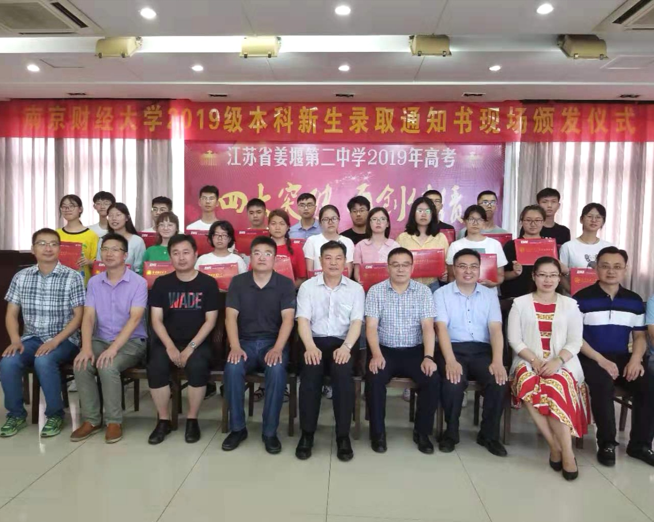 7月21日,校党委副书记温潘亚前往泰州中学和姜堰二中为2019级新生颁发录取通知书。泰州中学副校长蔡长春,姜堰二中党委书记、校长游忠,副校长朱进等出席颁发仪式。温潘亚副书记向今年被我校录取的新生及家长表示祝贺,也向两所中学多年来源源不断地为我校培养和输送大批优质生源表示谢意,并向两所中学赠送了高考喜报。在两所中学召开的座谈会上,温潘亚副书记向师生和新生家长介绍了我校的基本情况和人才培养思路,希望新生们在南京财经大学的四年里,不断锤炼品性、掌握知识、培养能力,努力成为德智体美劳全面发展的社会主义建设者和接班人。