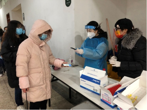 游思淳老师和李丽萍老师迎着三月的凄风站到了检测的第一个入口处。他们负责清点每次放入人数,维持现场秩序和指导被检测人员正确使用身份码。一个班次下来他们的手脚都有点僵。但为了此次核酸检测工作的顺利完成,他们在寒风中坚守,用内心的热情之火对抗着那不速的凄风与苦雨。