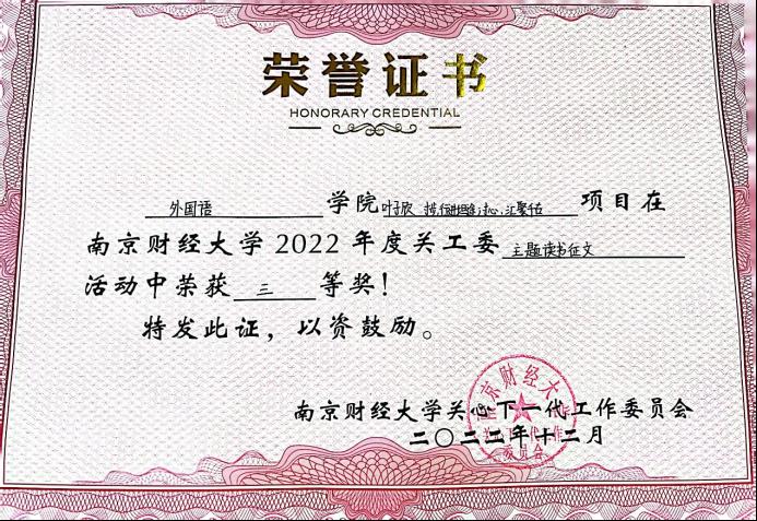 此外,在江苏省教育系统关工委举办的“2022年主题教育读书及征文活动”中,体育赛事直播 法语2201班叶子欣同学撰写的文章《寸步,行进坦途;寸心,汇聚千古》荣获三等奖。