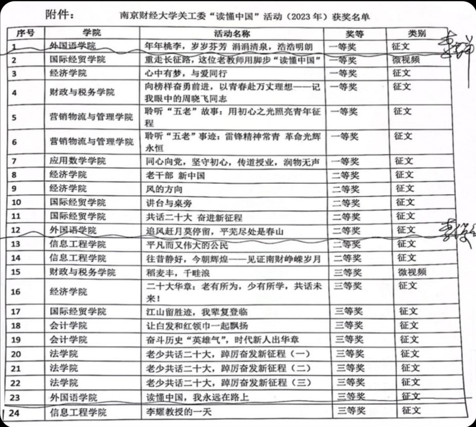 此外,在江苏省教育系统关工委举办的“读懂中国”征文活动中,体育赛事直播 叶子欣、吉柏衡两名同学采访撰写的《年年桃李,岁岁芬芳涓涓清泉,浩浩明朗——记体育直播平台 李群老师》、朱秋燃、陈典两名同学采访撰写的《追风赶月莫停留,平芜尽处是春山——记南京财经大学体育直播平台 退休教师李俊儒教授》两篇征文分别获学校一、二等奖,《读懂中国,我永远在路上》获三等奖。