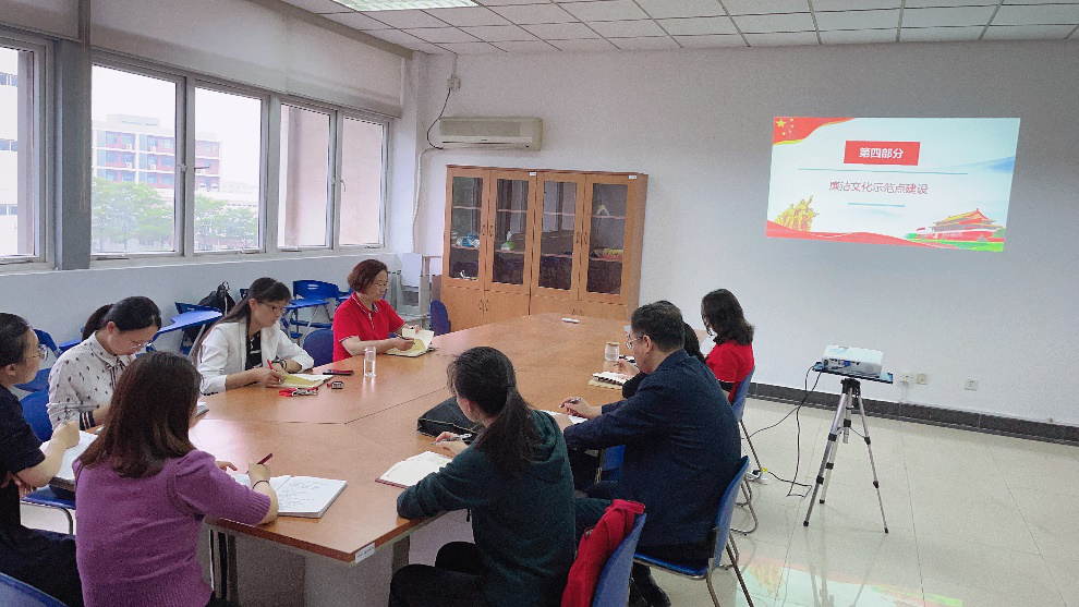 参会成员就体育赛事直播 廉洁文化示范点建设进行了研讨。大家就围绕专业特色建设具有外语特色的廉洁文化达成了共识。近期,将以党支部为单位,开展廉洁诗词朗诵、翻译《爱莲说》等中国优秀诗词作品、廉洁漫画大赛等。在廉洁文化建设中提升专业能力,在外译研究中讲好中国故事,在专业学习中贯彻好课程思政,将廉洁因子融入外院师生的学业。