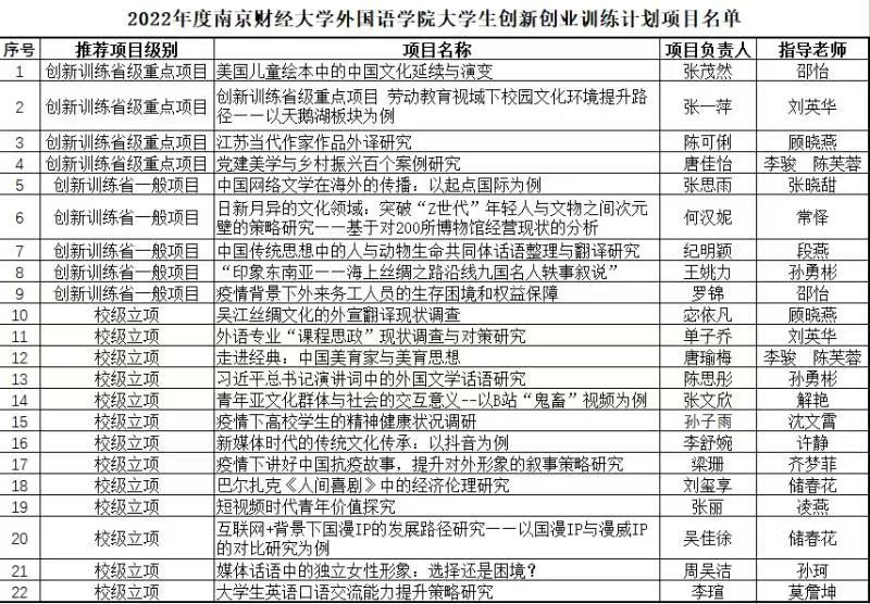 根据《省教育厅办公室关于做好2022年大学生创新创业训练计划项目申报工作的通知》(苏教办高函〔2022〕5号)和《关于组织申报2022年度南京财经大学大学生创新创业训练计划项目的通知》(南财教字〔2022〕16号)文件要求,经体育直播平台 初评推荐、学校组织专家评审、校内公示,经体育直播平台 初评推荐、学校组织专家评审,共立项326项,其中推荐省级大学生创新训练计划重点项目60项、创业实践重点项目1项、创业训练重点项目5项、创新训练计划一般项目70项,立项校级项目190项(见附件)。期中体育赛事直播 获推荐省级大学生创新训练计划重点项目4项、创新训练计划一般项目5项、校级项目13项(见附件)。