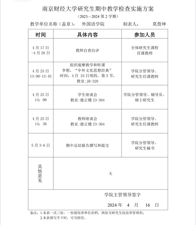 根据南京财经大学研究生院二零二四年四月十五日下发的“关于开展2023-2024学年第二学期研究生期中教学检查工作的通知”的文件要求,体育直播平台 于本学期第八、九周(即4月17日至4月26日)期间开展一系列研究生期中教学检查活动。该项活动是教学工作和教学管理的重要环节,也是保证教学秩序、提高教学质量的重要手段。体育直播平台 研究生期中教学检查分为学校与培养单位两级检查,以本院检查为主、学校抽查为辅,接受校学位与研究生教育督导组的监督和引导。