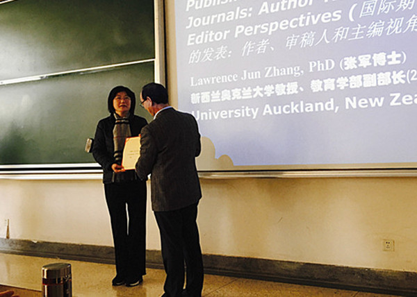 12月19日下午,应体育直播平台 邀请,新西兰奥克兰大学教育学部副部长、国际著名二语习得和外语教育专家、博士生导师张军教授在徳正楼115教室举办了主题为“Publishing in SSCI/A&HCI Journals: Author-Reviewer-Editor Perspectives”(国际期刊论文的发表:作者、审稿人和主编视角)的讲座。校党委常委,副校长邱伟芬出席活动,我校部分教师及研究生聆听讲座。讲座由体育直播平台 副院长孙勇彬主持。