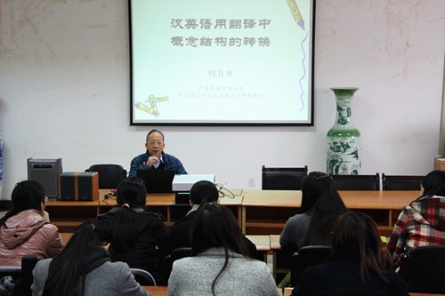 12月10日下午,受体育直播平台 邀请,广东外语外贸大学何自然教授在法政学科楼308会议室作了题为《汉英语用翻译中概念结构的转化》的报告。体育直播平台 部分教师和学生聆听了报告,报告由体育直播平台 院长肖辉主持。