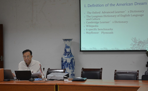 10月31日晚,解放军国际关系体育直播平台 教授、博士生导师、全国高校英语报刊教学研究会会长端木义万应邀来体育赛事直播 讲学。讲座在法政学科楼308会议室举行,端木教授作了以“美国梦的今与昔”为题的主题演讲。讲座由体育直播平台 院长肖辉教授主持。