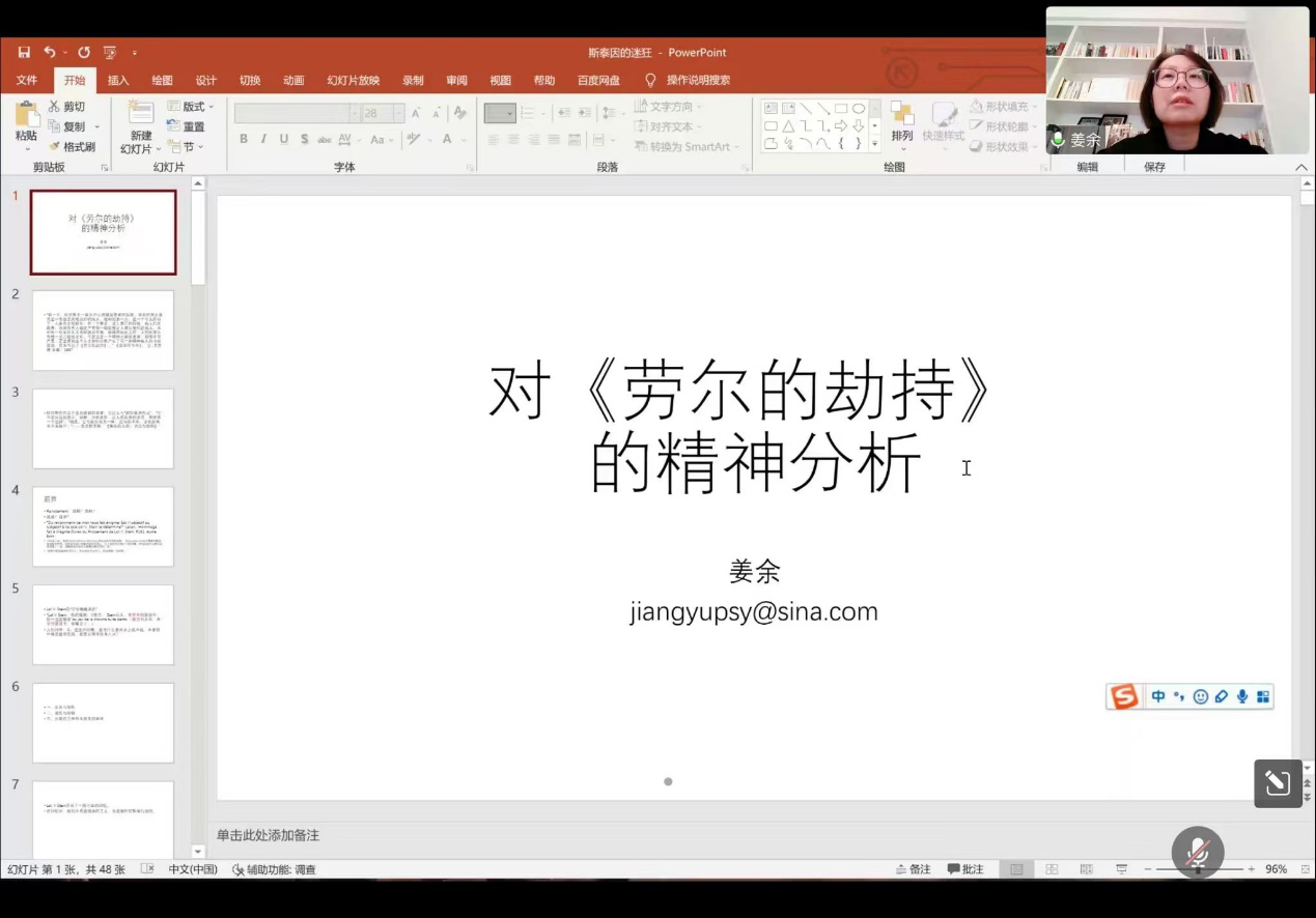 此次讲座中,姜博士分成了四个部分来讲解。首先,姜博士从分析作者杜拉斯及其作品入手,带我们了解《劳儿之劫》的创作背景与时代背景,还介绍了著名精神分析学家对此作品的解读和评价,例如:克里斯蒂娃和拉康,接着,结合作者的生活经历,开始引入对于本作品的深入分析。第二部分,姜博士分析了书名的含义,利用题目迷惑了读者,以不确定书名的具体意思来评价了杜拉斯的高明之处。随后第三个部分,姜博士从三个角度结合原文片段分析《劳儿之劫》的主要人物特点,为我们解释了书中的三个角度:实在与创伤、哀伤与抑郁和分裂的主体和未丧失的客体,姜博士带领我们近距离走进劳儿的过去。从劳儿年轻时受到过的创伤到十年后,角色之间关系的转换,清晰解读了劳儿,让我们能走进她的内心,体会她的经历。最后,第四部分,姜博士对整个讲座内容进行了总结,也结合了她的多年实践向我们介绍了精神分析在生活中的用处。在讲座完成后,孙冬教授对姜博士关于弗洛依德的享乐原则与拉康的快感享乐概念进行相关提问,引入了享乐概念与表层字面含义的新的隐喻启蒙,使人受益匪浅。
