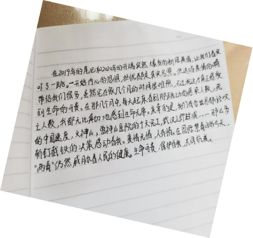 同样来自商务英语1901的李炳卿同学告诉了我们她的抗疫故事与感受,她写道:“ 在2019的尾巴和2020的开端突然爆发的新冠疫情,让我们所有人都着实吓了一跳。一开始内心的恐惧,担忧都是我们内心的真实写照。但这场疫情的确带给我们很多,虽然宅在家几个月的时间很难熬,不过我才真正感受到了生命的珍贵。在那几个月中,我每天早上起床,看到那跳动的感染人数,死亡人数,我都无比真切地感受到了生命无常。庆幸的是国家的反应无比迅速,火神山,雷神山仅用十天建好,武汉立即封城…….那么多斩钉截铁的决策感动着我。疫情无情,人有情。在国际禁毒日的今天,“两毒”仍然威胁着人民的健康,生命。生命可贵,保护自我,共同抗疫。“ 李同学的亲身经历,切身感受应该就是很多人的感受吧。对于生命的无常的无奈,对国家决策力的歌颂,以及对我们未来共同抗疫的决心。