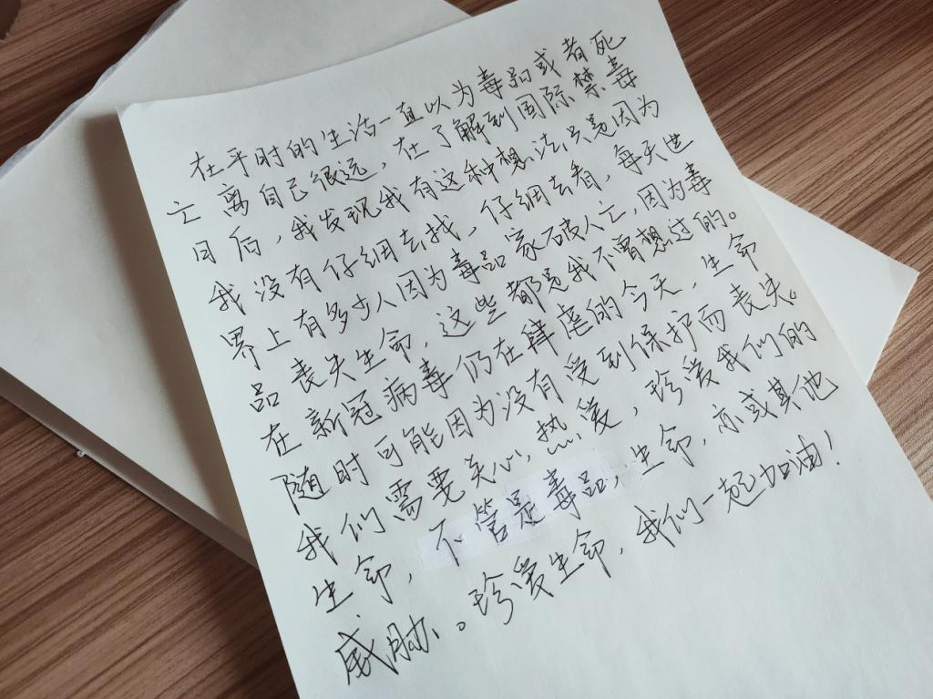6月26日是国际禁毒日,在经历了新冠病毒的袭击之后,人们更加懂得珍惜生命。如今新冠病毒仍未远去,面对“两毒”威胁的当代青年人会做出怎样的回应。体育赛事直播 的大学生们用拿起纸笔,写下了他们对于禁毒和生命的珍爱。