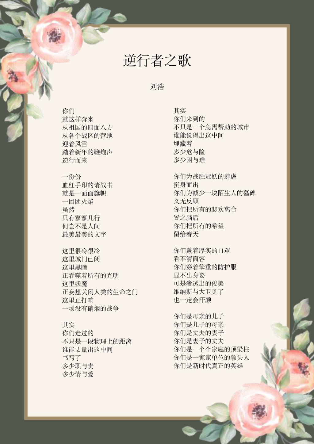体育直播平台 党委书记刘浩感动于“逆行者”的无畏奉献,创作原创诗歌《逆行者之歌》,歌颂他们不畏艰险、为大爱舍弃小爱的无私精神,传递社会正能量。诗歌写到:“你们为战胜冠妖的肆虐挺身而出,你们为减少一块陌生人的墓碑义无反顾,你们把所有的悲欢离合置之脑后,你们把所有的希望留给春天。”