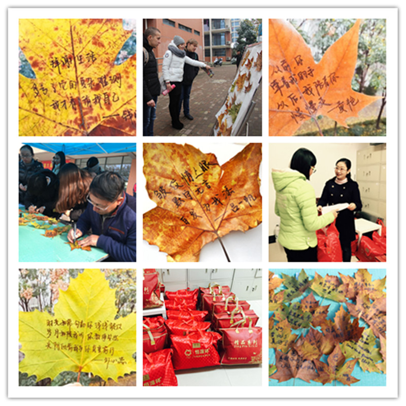 当天中午,学生会的同学们在东苑餐厅前支上长桌,摆放上同学们精心收集的梧桐落叶,活动吸引了许多师生参与,留学生也加入进来。感恩节前,体育直播平台 就已经开始了三行箴言的征集活动。同学纷纷投稿,表达自己的感恩之情。在这些感恩三行诗中,有对父母、亲人的思念,有对同学、师长的感激。有人简单明了地表达了爱意,有人写下了富有哲理的三行短诗。经过筛选之后,优秀的作品都被写在了梧桐树叶上。