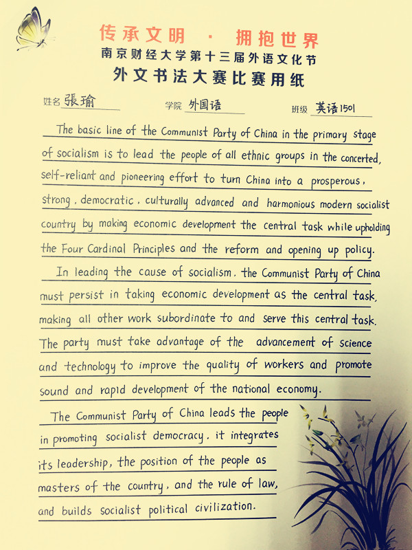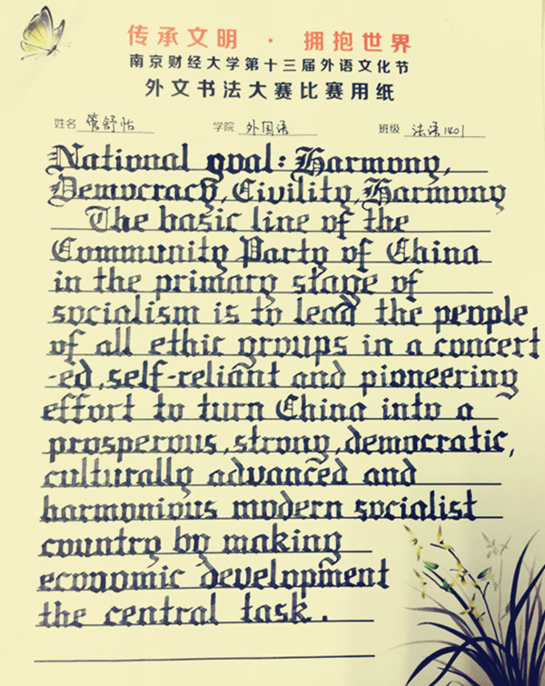 比赛收到了来自全校各个体育直播平台 的外文书写爱好者的三百多份参赛作品,除了规定内容以外,在自选内容的书写上还出现了法语、日语、韩语等小语种内容。参赛选手笔法各异,各有特色。秉承着公平、公正的原则,主办方根据书写的整洁美观度、书写内容及书写格式、流畅度等作为评选标准,最终,来自体育直播平台 法语1401班的管舒怡同学凭借一份哥特体的书写内容和一份花体法语的书写作品获得比赛一等奖,新闻体育直播平台 的赵依琳同学、体育直播平台 的程戎同学获得二等奖。国际经贸体育直播平台 王舒晴等3位来自不同体育直播平台 的同学获得三等奖。