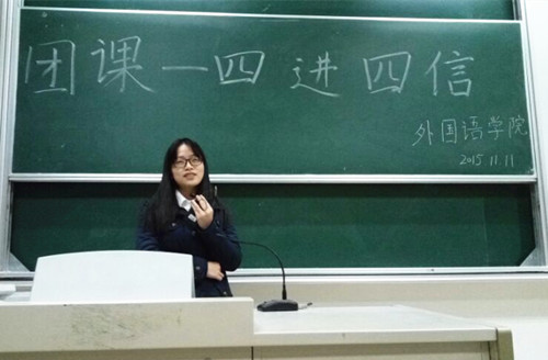 11月11日晚,体育赛事直播 新生团校(第三期)在经济学科楼111教室开展专题团课授课活动,本次团课由校团委遴选的团课小老师,体育赛事直播 学生会副主席、英语1302班团支书杨柳同学主讲,全体新生团员参与此次团课。