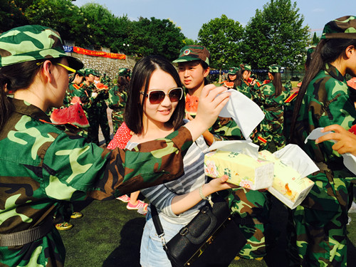 9月8日是新生军训的第三天,当天下午,体育赛事直播 党委副书记李慕原、学工办主任兼15级辅导员薛桂芳和几位学长学姐一同前往中苑足球场看望正在军训的新生,并给新生带去了清凉解渴的西瓜。
