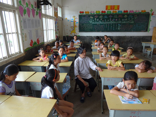 每天两个小时的教学时间,前一个小时由老歌师教唱侗歌,前三天已完成侗族儿歌和蝉之歌的教学任务,后两天把男女生分开进行河边歌(对唱)教学,从歌词到歌声循序渐进。令人欣慰的是,再调皮的孩子在学习侗歌时也会立马变得聚精会神,连上厕所也要主动征得老师同意后才去;而孩子们童稚的歌声也吸引了学校附近的村民,常常有人顶着烈日到教室外围观,甚至有个别“编外”小学员来到少年侗歌班“偷师学艺”。而后一个小时则由“古梦清泉”暑期实践团成员开展辅导,作为语言专业的石贤给歌班小学员上了两堂日语课,教给孩子们几句简单的日常用语。令人惊奇的是有个小男孩学得特别快,而且发音十分标准,被任命为领读;学得慢的小朋友我们就鼓励他们课间单独找老师辅导,多练习几遍。于是课里课外都充满好学的气氛,小朋友之间互相道礼,十分可人。而理科出生的吴绍依同学则发挥自己的专业特长,给孩子们辅导数学,耐心细致地一遍遍引导他们去思考。为了培养孩子们的集体意识,同学们还带领他们做些小游戏,一起完成小任务等。经过一周的相处,实践队员和少年侗歌班的孩子日渐亲密起来,黑板上每天更新的倒计时不仅提示着汇报演出的日期,同时也标示着大家日渐缩短的相处时间。